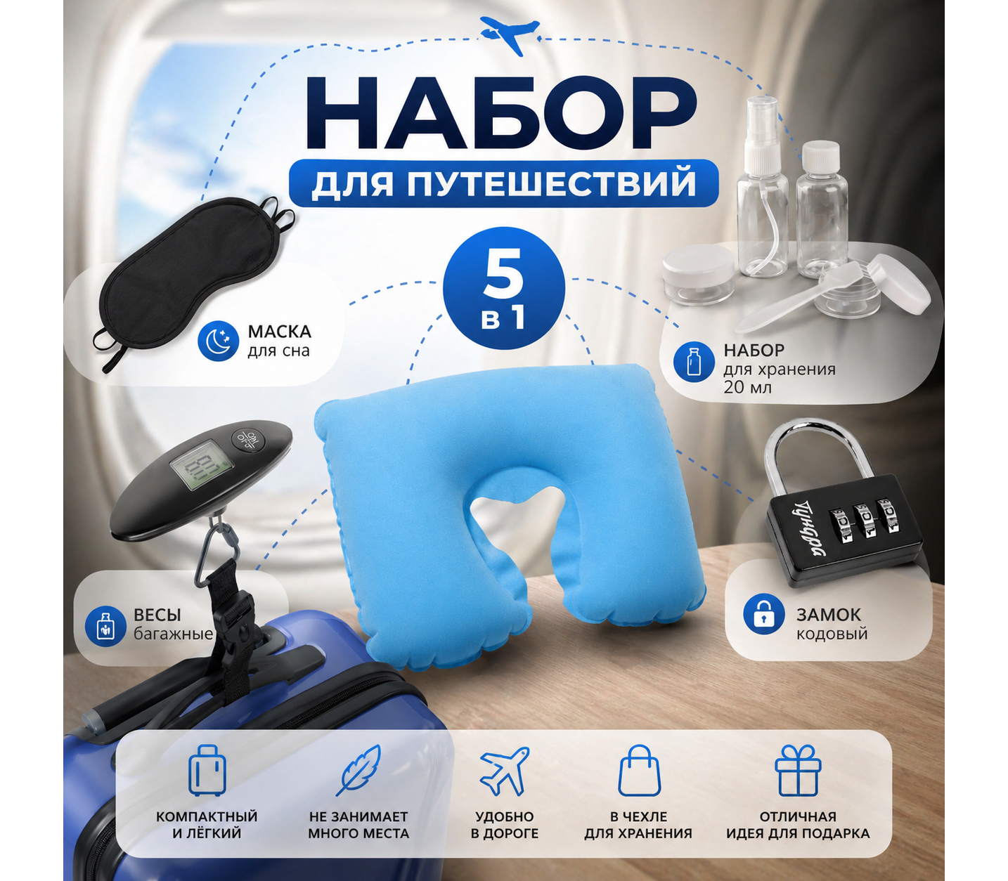 Набор для путешествий 5 в 1 — это продуманный комплект аксессуаров, который делает любую поездку удобной, спокойной и организованной. В одном наборе собраны самые необходимые вещи для перелётов, поездок на поезде или автомобиле: маска для сна, надувная подушка для шеи, багажные весы, набор контейнеров для жидкостей и кодовый замок для чемодана.
