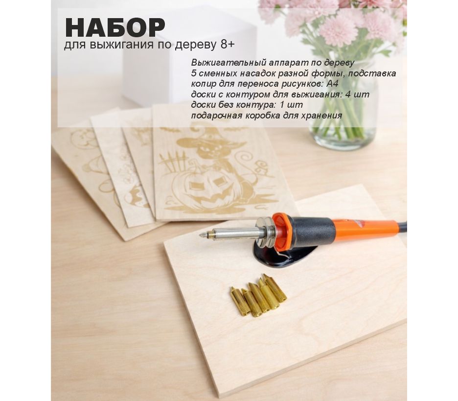 Набор для выжигания по дереву «Праздники» — это увлекательный творческий комплект для детей от 8 лет, который позволяет создавать тематические рисунки и декоративные работы своими руками. Набор идеально подойдёт для развития творческих навыков, усидчивости и внимательности, а также станет отличным вариантом полезного досуга без гаджетов.