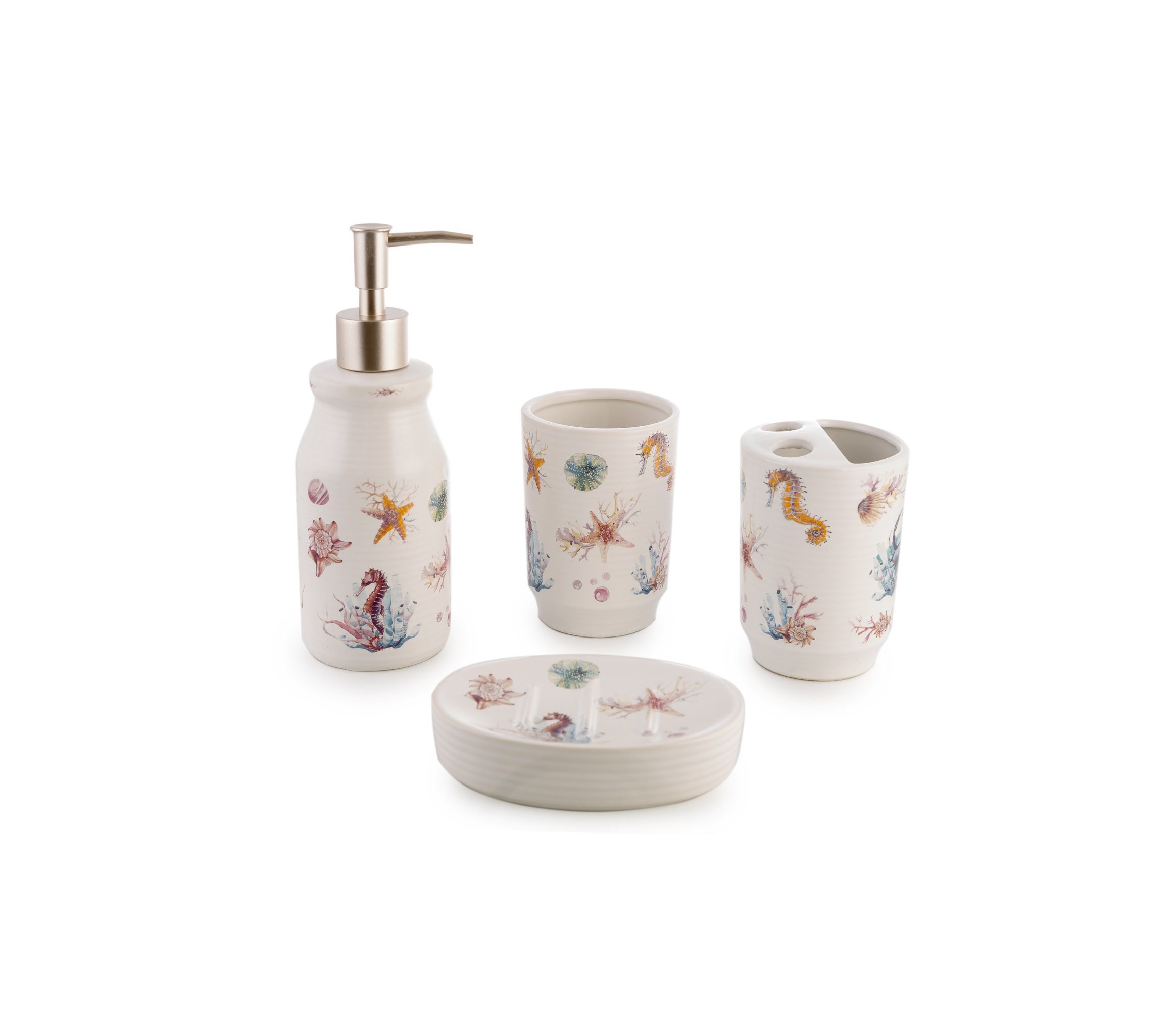 Обновите вашу ванную комнату с нашим стильным набором аксессуаров (4 предмета) из керамики. Включает мыльницу, дозатор и стаканы для зубных щеток с элегантным рисунком морских обитателей. Этот набор станет не только практичным, но и эстетичным дополнением вашего интерьера. Закажите прямо сейчас и наслаждайтесь красотой и функциональностью в вашей ванной комнате!