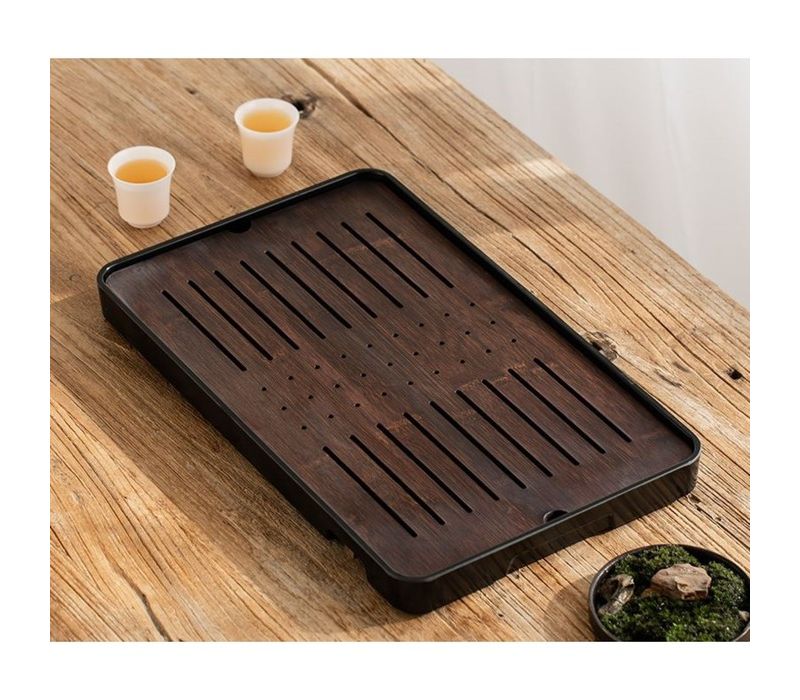 Бамбук отличается прочностью, устойчивостью к влаге и долговечностью. Натуральная текстура материала гармонично сочетается с лаконичным чёрным поддоном, создавая современный минималистичный образ. Компактный размер позволяет разместить на подносе чайник, гайвань, пиалы и необходимые инструменты.