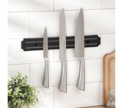 Держатель легко крепится на стену и подходит не только для ножей, но и для другой металлической кухонной утвари: ножниц, лопаток, щипцов. Лаконичный и современный дизайн гармонично вписывается в любой интерьер кухни — от классического до минимализма. Это функциональный аксессуар, который делает кухню более удобной, аккуратной и стильной.