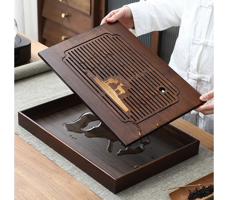 Прямоугольная форма и компактные размеры делают чабань удобной для дома, офиса или чайного уголка. На подносе легко разместятся чайник, пиалы, гайвань и другие чайные аксессуары, сохраняя порядок и чистоту на столе. Встроенный слив воды позволяет спокойно проливать чай, не беспокоясь о разливах и каплях — вся лишняя жидкость аккуратно собирается внутри подноса.