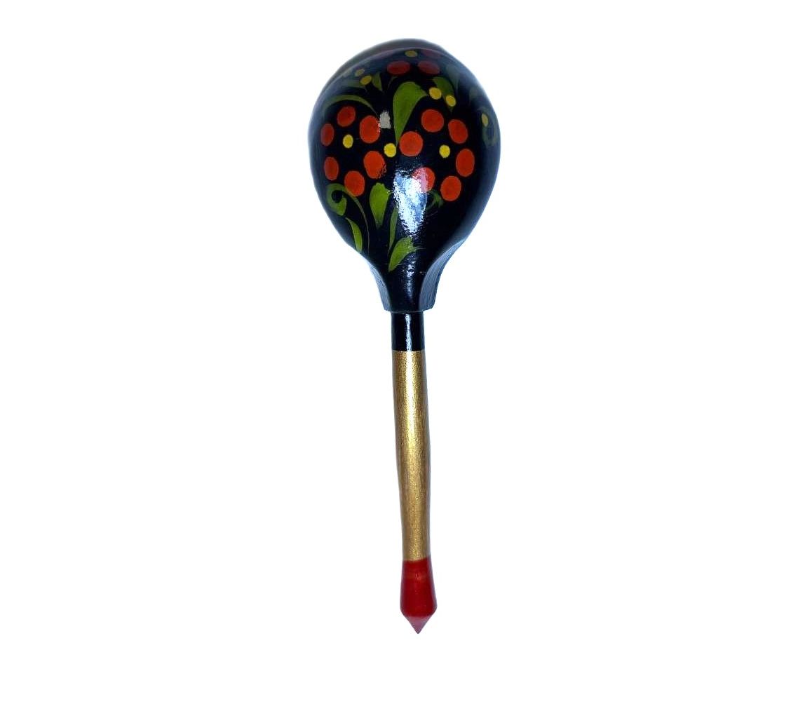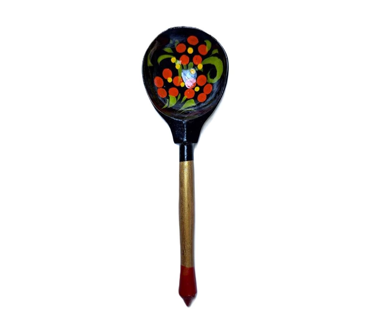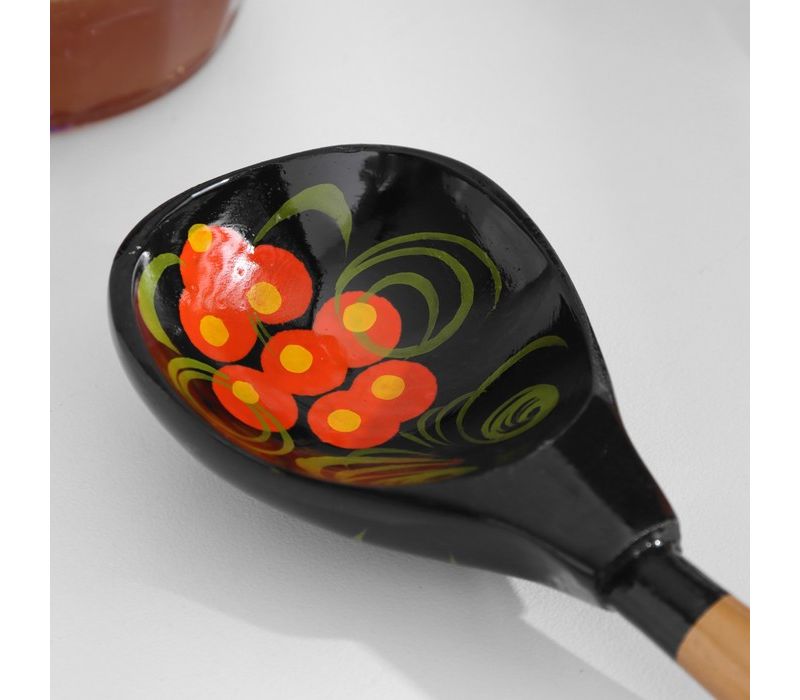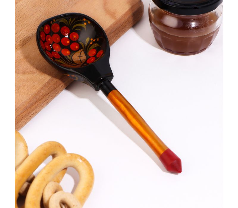 Ложка украшена классическими хохломскими узорами в насыщенных чёрных, красных и золотистых оттенках. Такой контрастный и выразительный дизайн делает её не только удобным инструментом для кухни, но и стильным элементом сервировки или декора. Благодаря длине около 18 см и удобной фигурной ручке ложка комфортно лежит в руке и подходит для повседневного использования.