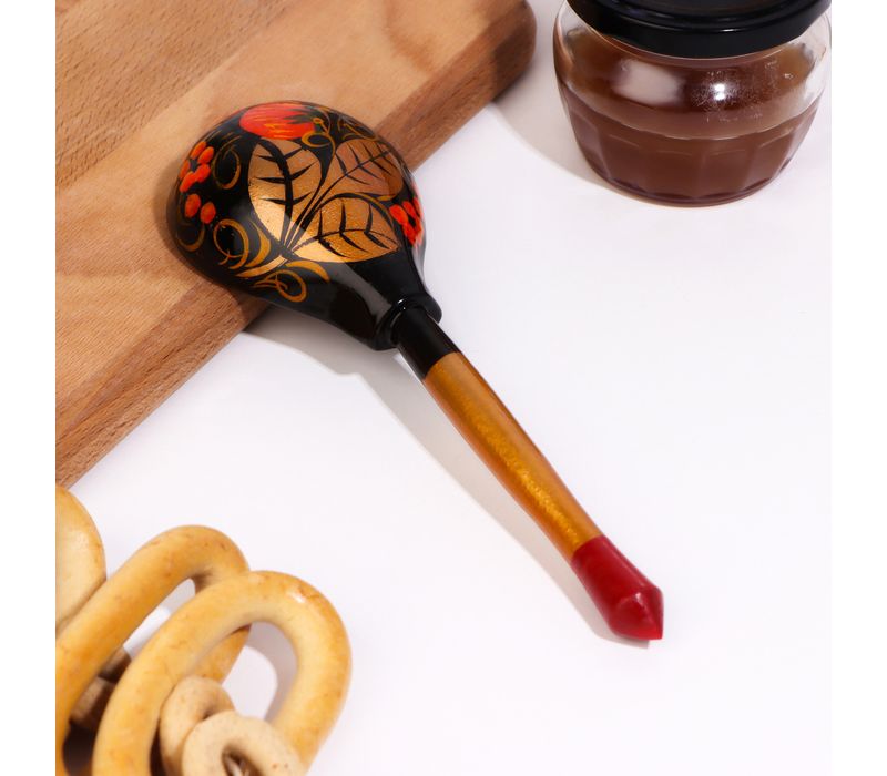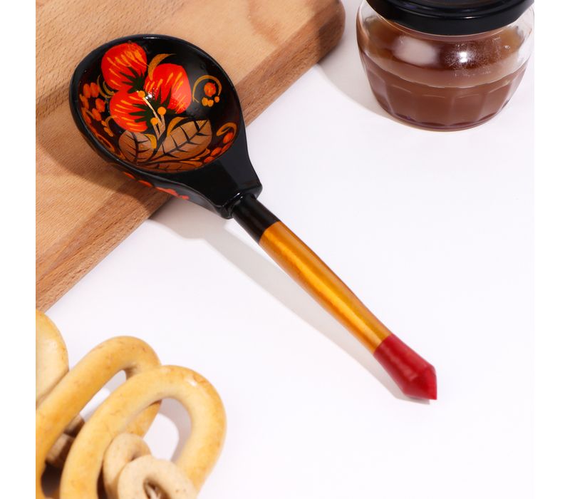 Главная особенность ложки — яркая ручная роспись с ягодным орнаментом. Красочные элементы на светлом фоне придают изделию тёплый, уютный вид и делают его настоящим украшением кухни. Такая ложка отлично впишется в интерьер в народном стиле и станет красивым акцентом при сервировке.