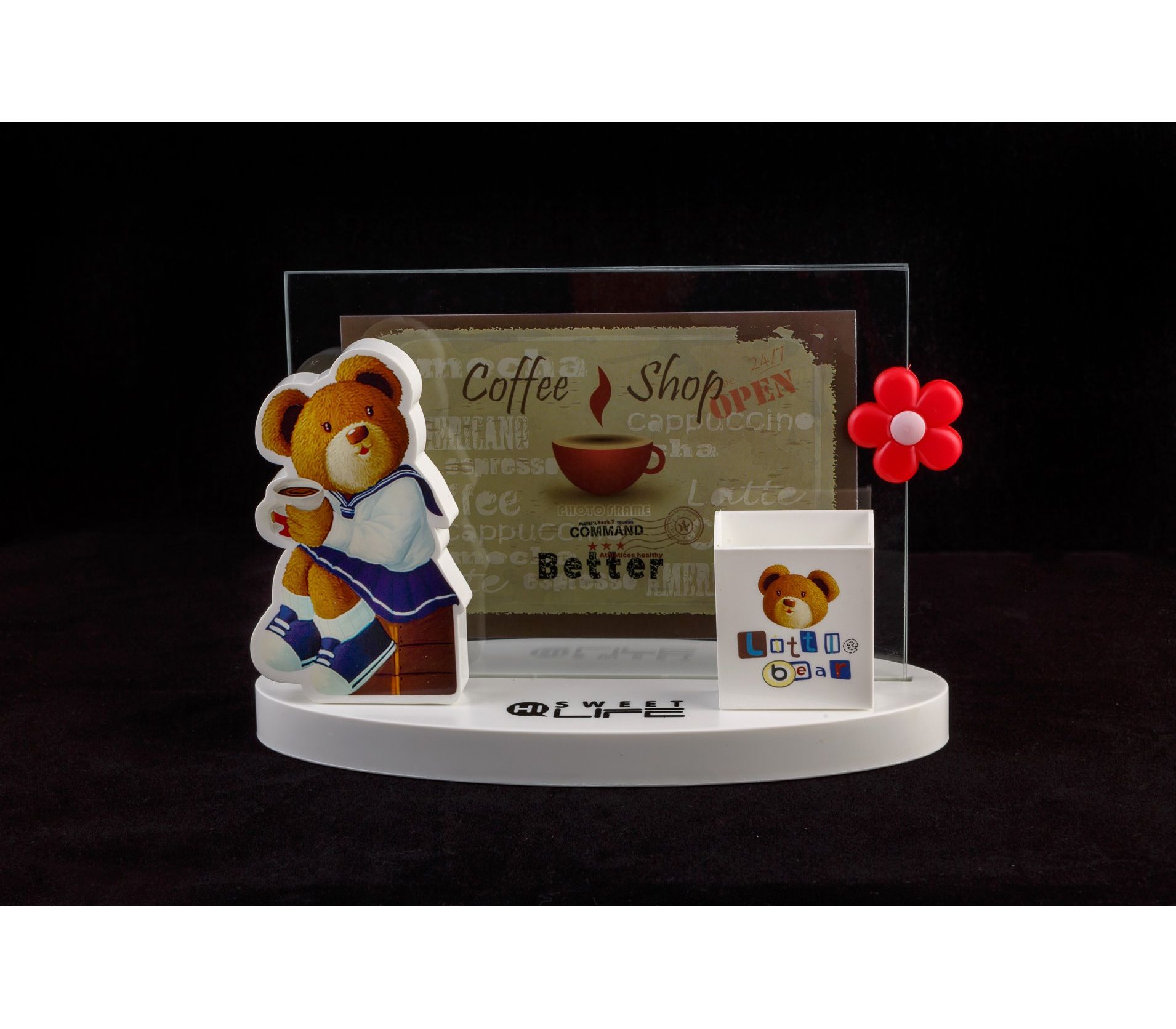- Дополнительные элементы: Фигурка медвежонка и цветка, стаканчик для авторучек или карандашей