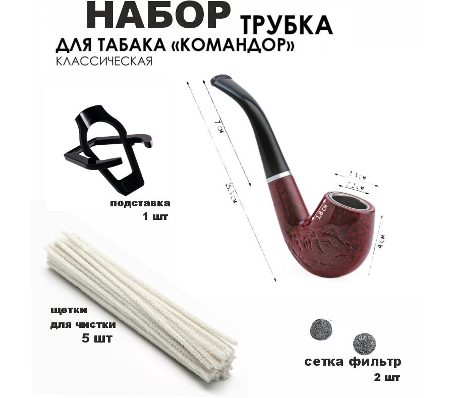 Трубка изготовлена из качественных материалов, что обеспечивает удобство и практичность. В комплект входит все необходимое для удобного использования: сама трубка, набор из пяти щеток для чистки, два сетчатых фильтра и подставка для трубки. Благодаря этому уход за трубкой становится простым и удобным, а хранение — аккуратным и безопасным.