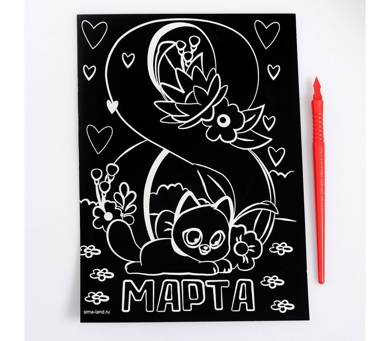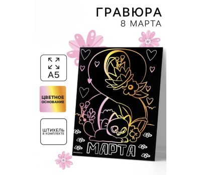 Гравюра «8 Марта» с цветной основой формата А5 — это творческий набор, который позволяет создать красивую и символичную открытку своими руками. Такой формат отлично подойдёт для детей и взрослых, которые хотят сделать оригинальный подарок к Международному женскому дню, вложив в него внимание и тепло.