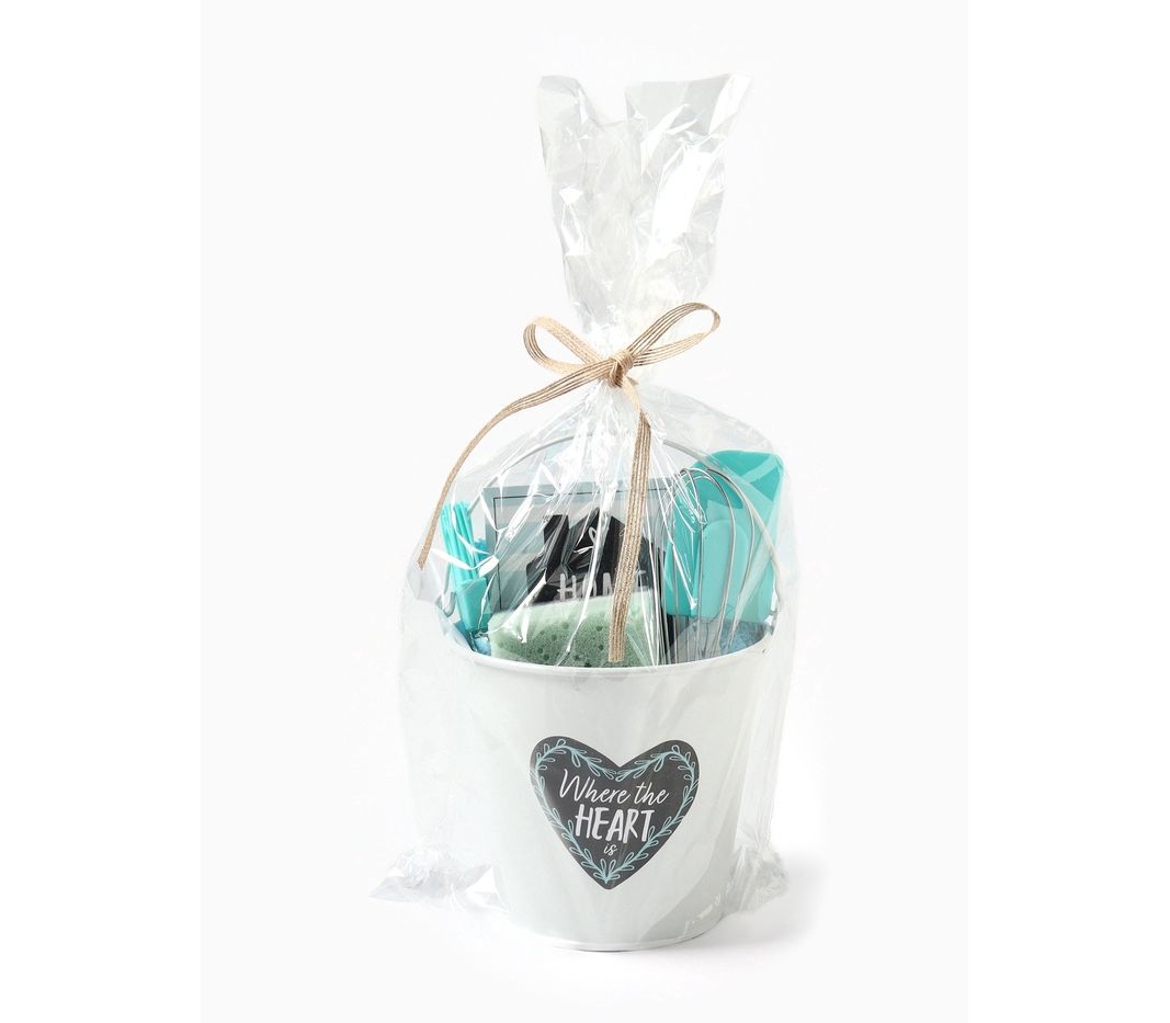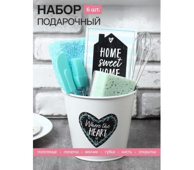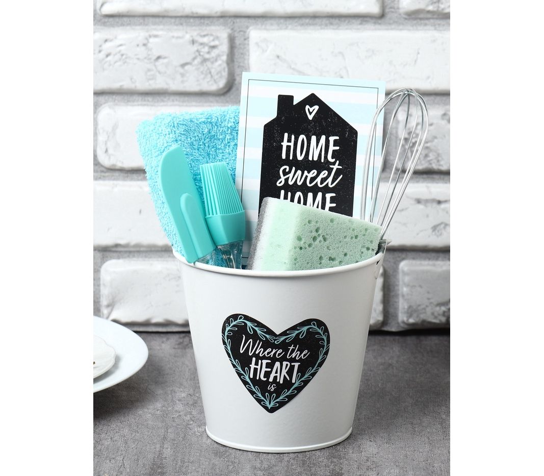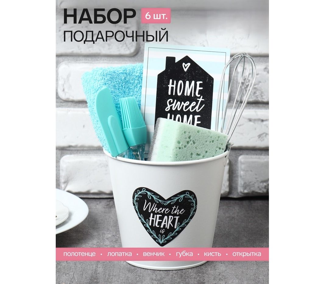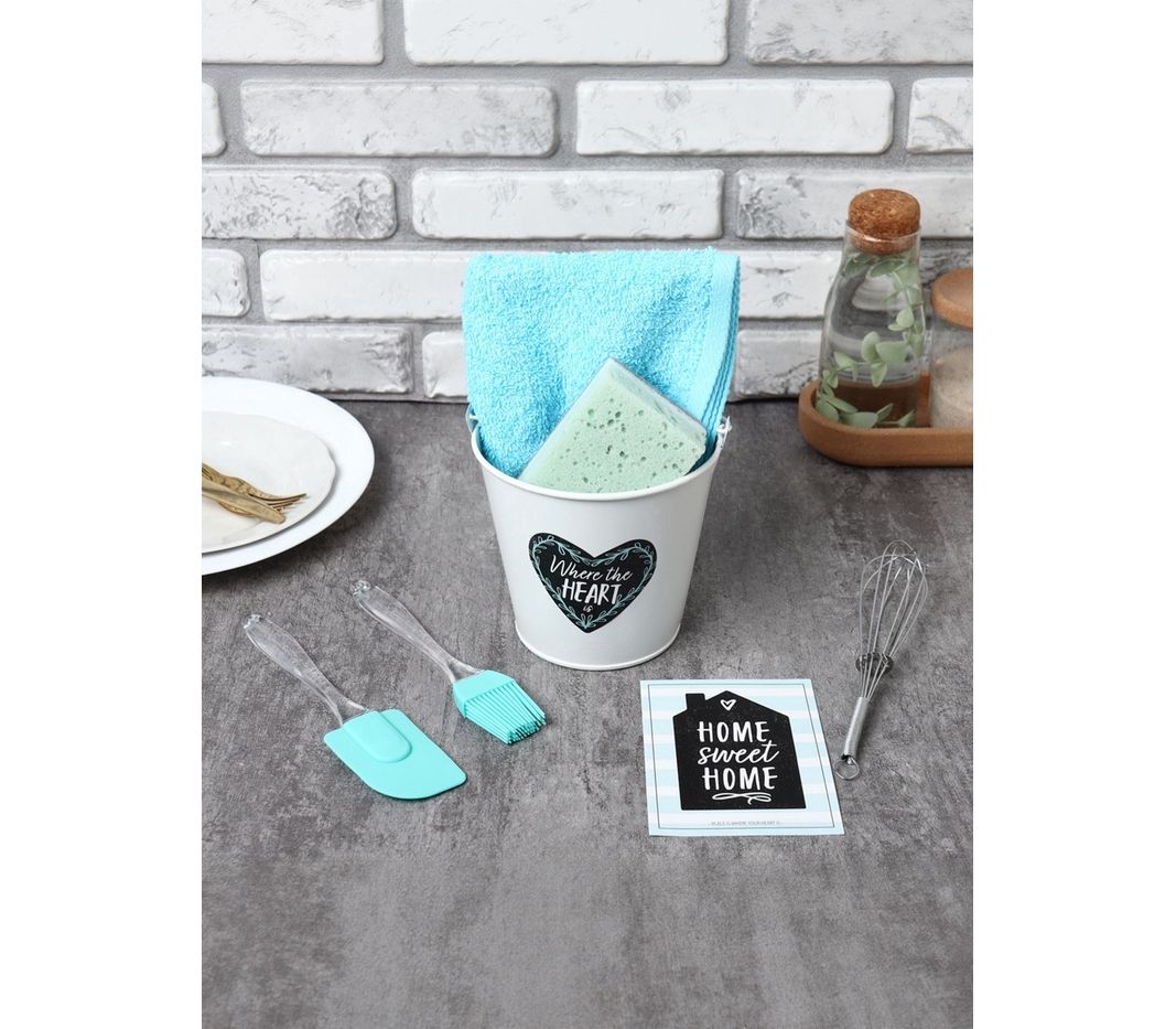 - Составляющие набора: Ведёрко, Венчик, Губка для мытья посуды, Кулинарная кисть, Кухонная лопатка, Открытка, Полотенце