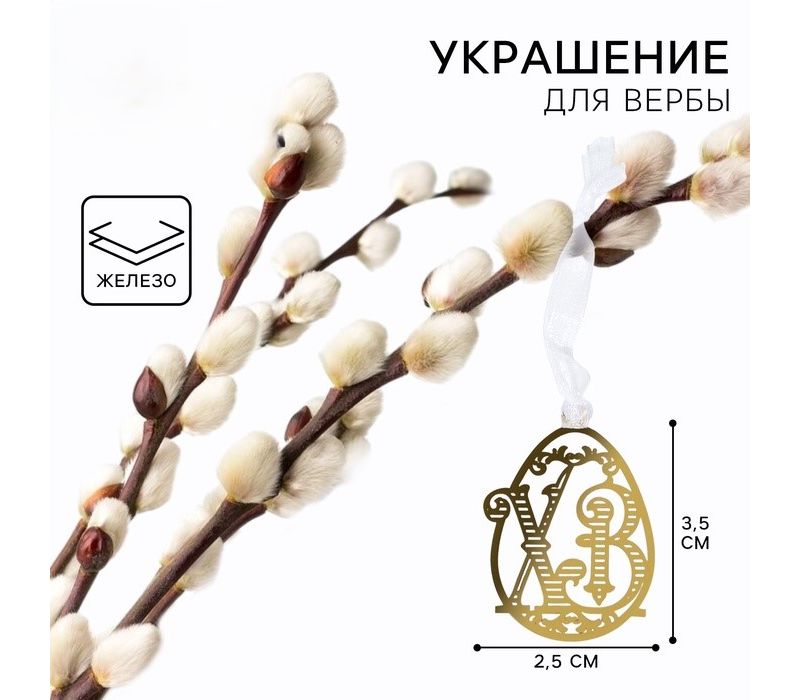 Украшение для вербы «ХВ» на Пасху — это маленький, но очень эффектный декоративный элемент, который добавит празднику торжественности и светлой атмосферы. Размер изделия 2,5 × 3,5 см делает его аккуратным и удобным для крепления к веточкам вербы, а также для оформления пасхальных подарков и праздничных композиций.