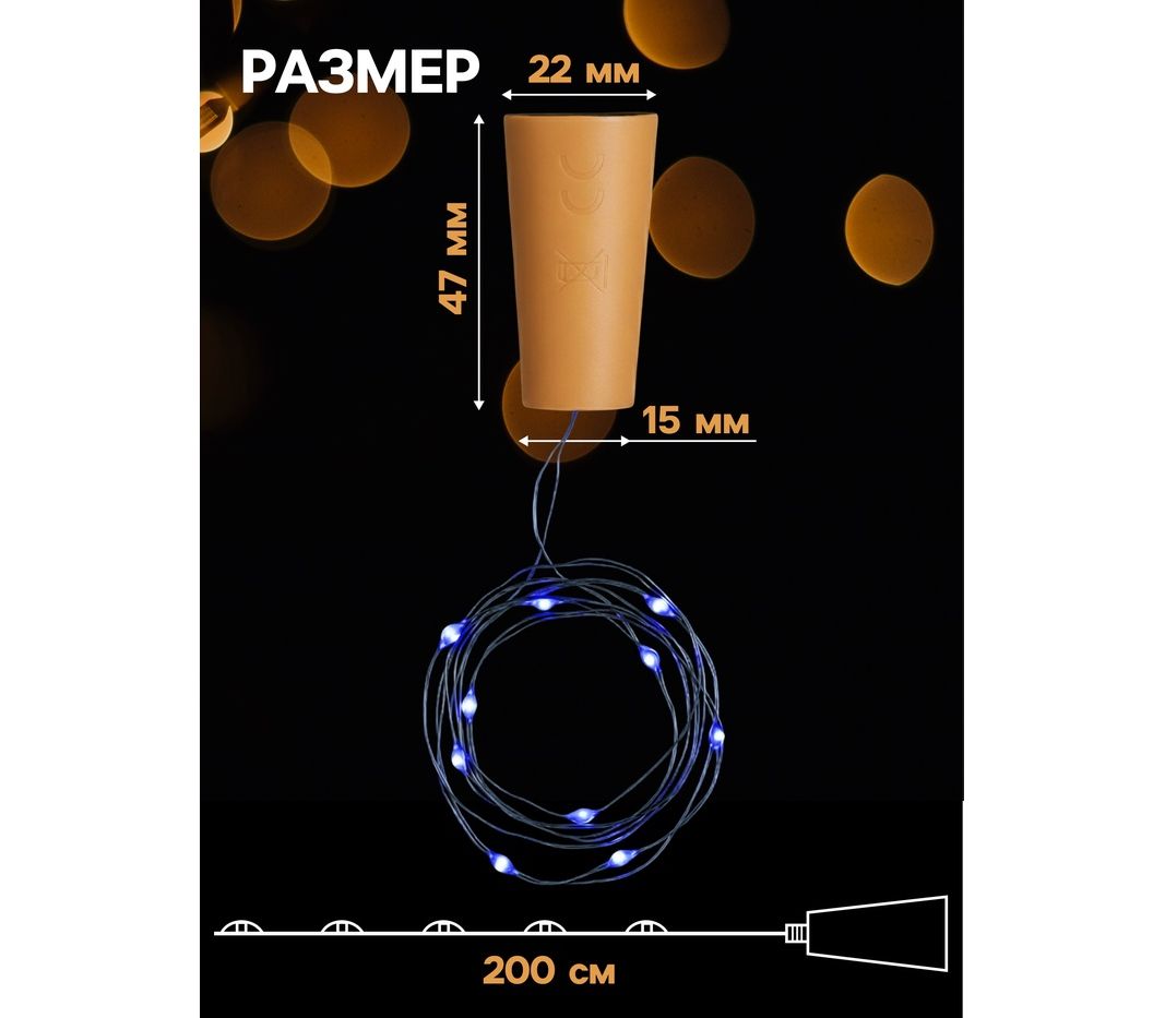 Создайте волшебную атмосферу с гирляндой «Нить» 2 м роса с пробкой — компактным и стильным источником мягкого света. Эта миниатюрная гирлянда длиной 2 метра состоит из тонкой серебристой проволоки с 20 яркими светодиодами, излучающими синий свет. Она идеально подходит для создания уютного освещения в доме, на праздничном столе, в стеклянных бутылках или банках, а также для декора интерьера, фотосессий и подарков.