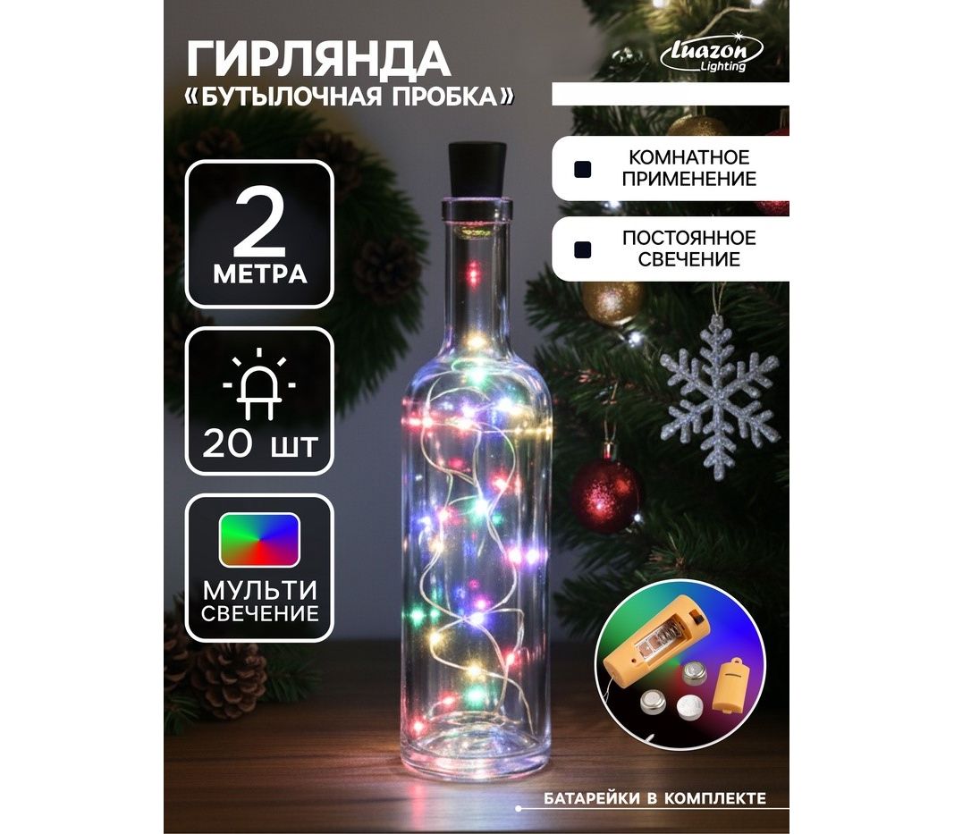 Создайте волшебную атмосферу с гирляндой «Нить» 2 м роса с пробкой — компактным и стильным источником мягкого света. Эта миниатюрная гирлянда длиной 2 метра состоит из тонкой серебристой проволоки с 20 яркими светодиодами, излучающими мульти свет. Она идеально подходит для создания уютного освещения в доме, на праздничном столе, в стеклянных бутылках или банках, а также для декора интерьера, фотосессий и подарков.