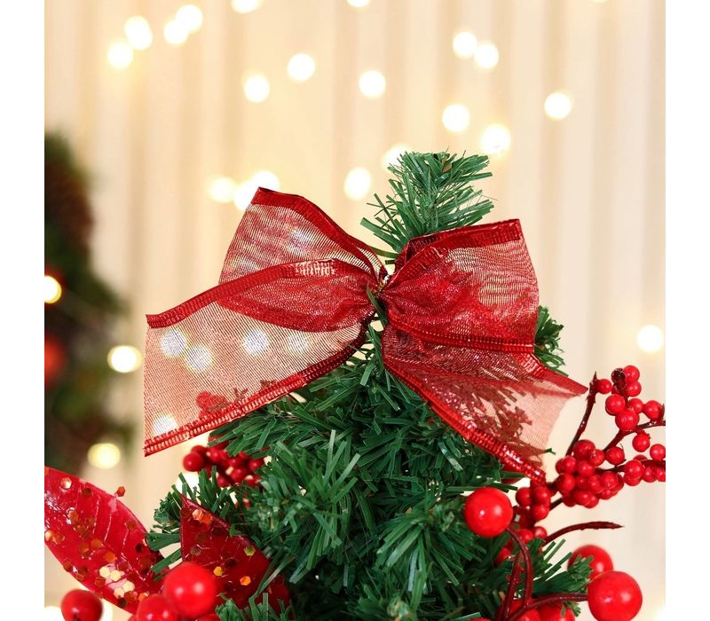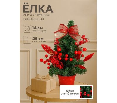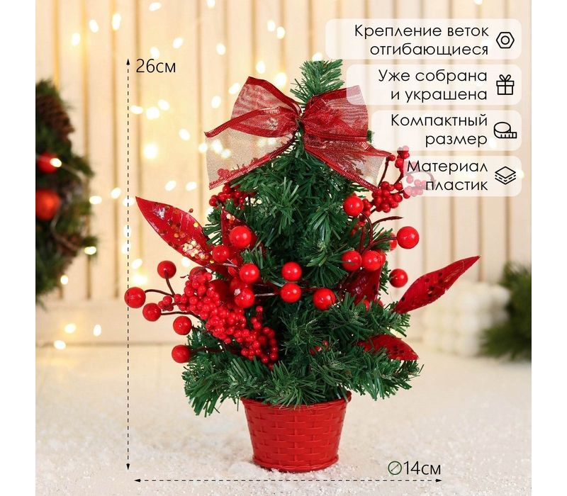 Зелёная хвоя гармонично сочетается с красным декором, создавая классический новогодний образ, наполненный теплом и доброжелательной атмосферой. Такая ёлка станет прекрасным украшением рабочего стола, подоконника, полки, тумбы или зоны ресепшн. Она одинаково хорошо подойдёт для дома, офиса, витрины или подарочного оформления.