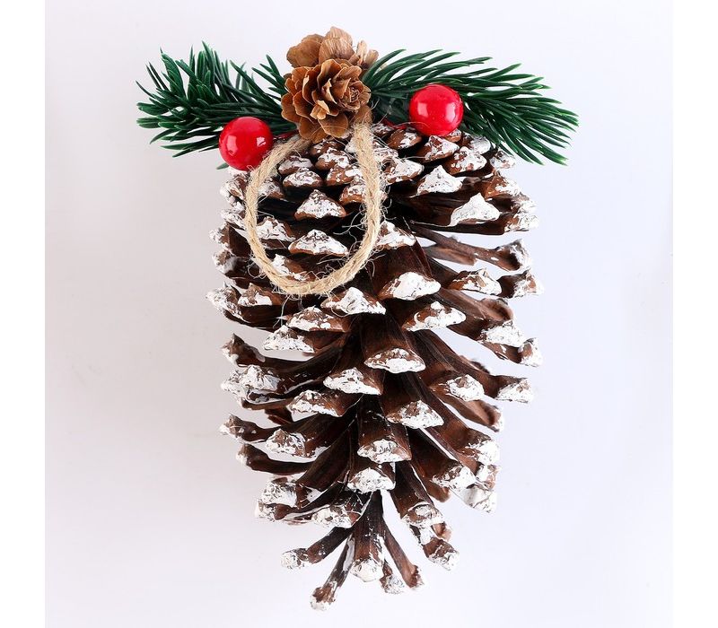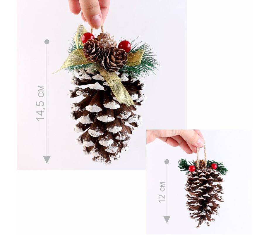 В набор входят две шишки длиной 14,5 см и 12 см, выполненные из натурального материала. Они украшены декоративными элементами — миниатюрными ягодками, веточками и шапочкой из искусственного снега, создающего эффект морозного утренника. Такой декор прекрасно впишется в эко-стиль, скандинавский или классический интерьер, придавая ёлке природную гармонию и изысканность.