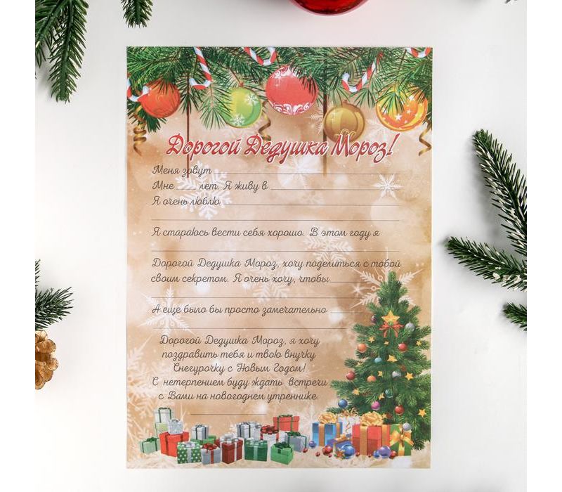 Письмо Деду Морозу «Подарки» формата А4 – это необычный и яркий способ подготовить особенное письмо для главного волшебника! Этот набор представляет собой красочное письмо, которое можно наполнить самыми нежными и заветными желаниями. Яркий дизайн и внимательные детали непременно привлекут внимание вашего малыша и создадут атмосферу настоящего чуда! И чтобы ваше послание дошло до адресата, не забудьте отправить его по правильному адресу: 162340, Россия, Вологодская область, г. Великий Устюг, Деду Морозу.
