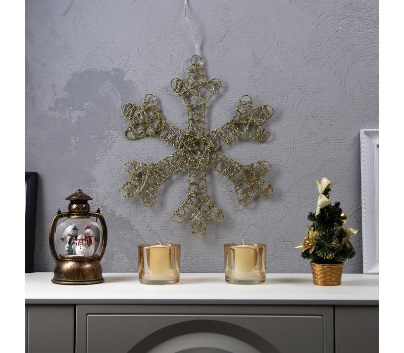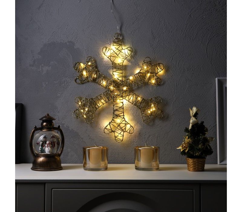 Фигура выполнена из прочного металла и снабжена 40 тёпло-белыми светодиодами, создающими мягкое, волшебное сияние. Свет равномерно рассеивается по контуру снежинки, наполняя пространство уютом и праздничным настроением. Благодаря питанию от батареек АА×3 (не входят в комплект), изделие можно разместить в любом месте — на стене, двери, полке или в витрине, без необходимости в розетке.