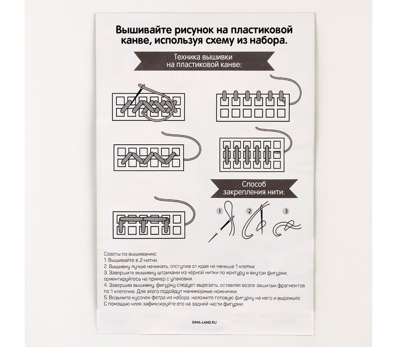 Во время работы ребёнок продевает нити мулине через отверстия канвы с помощью безопасной пластиковой иглы, следуя схеме из комплекта. Такой процесс развивает мелкую моторику, координацию движений, внимание и усидчивость. Чёткая схема помогает ребёнку ориентироваться в последовательности действий и аккуратно соблюдать рисунок, создавая яркий и аккуратный образ персонажа.