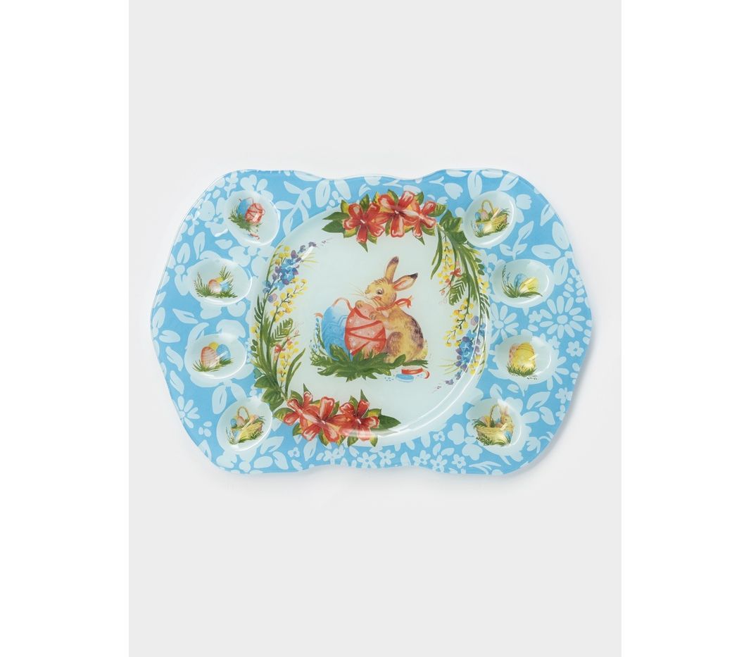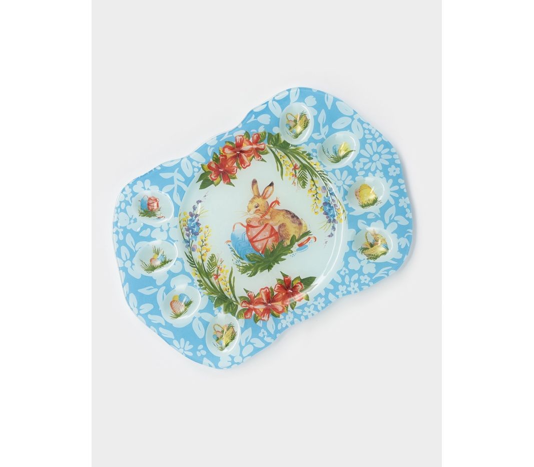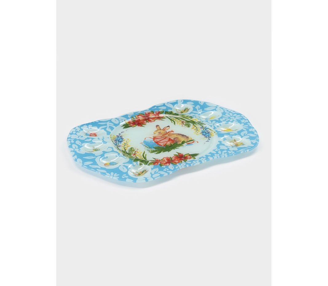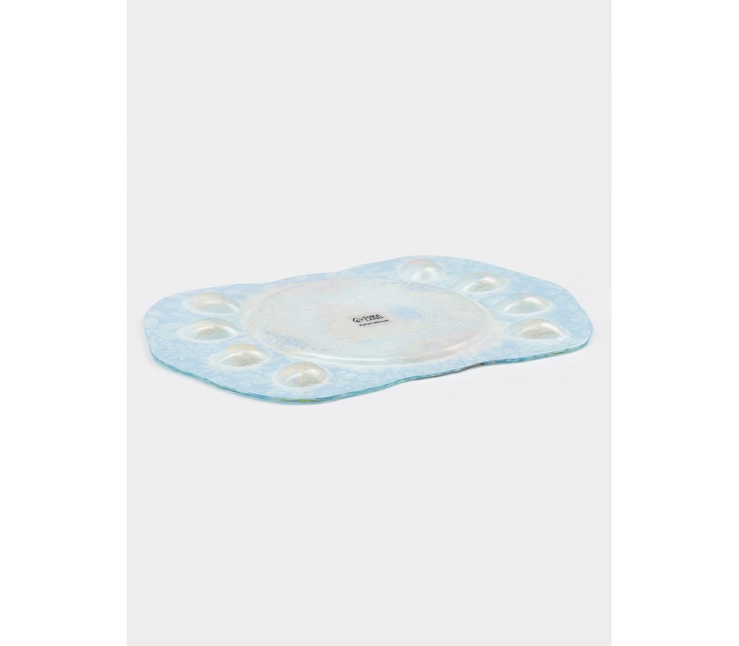 Подставка рассчитана на 8 яиц и под кулич диаметром до 20 см, что позволяет разместить традиционные пасхальные угощения в эстетичной и аккуратной композиции. Прозрачное стекло создаёт ощущение лёгкости, а голубой цвет рисунка добавляет свежести и праздничного настроения.